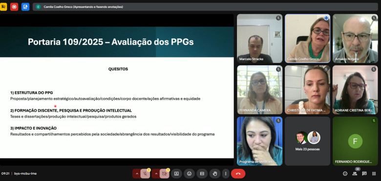 A atividade foi feita de forma remota e contou com a participação da professora Camila Coelho, que é bolsista de produtividade em pesquisa CNPq - nível 2, e atua como avaliadora de Programas de Pós-Graduação da área interdisciplinar da Capes. A profissional trouxe panoramas e uma sintetização das mudanças que ocorreram na ficha de avaliação em relação ao quadriênio anterior para os PPGs.