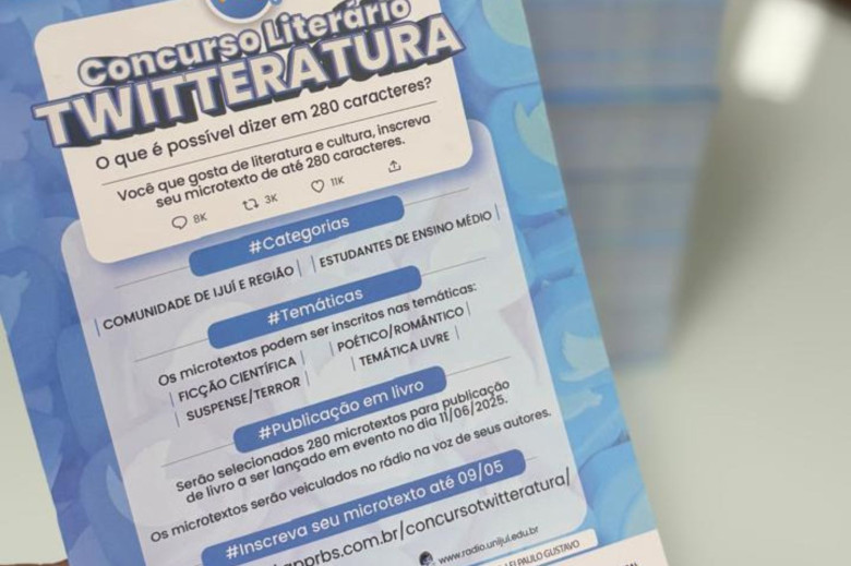 O Concurso de Twitteratura é aberto ao público regional e segue com inscrições até o dia 9 de maio, por meio da plataforma online da Unijuí. Ao final do processo, serão selecionados 280 microtextos, que integrarão um livro com registro ISBN e um áudio livro a ser veiculado na programação da Rádio UNIJUÍ FM.