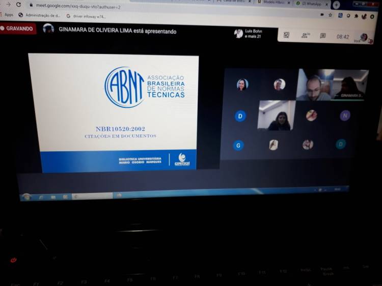 No último sábado, 15 de agosto, via Meet, a Biblioteca Universitária iniciou uma série de três webinários com o objetivo de oferecer à comunidade acadêmica capacitações sobre ABNT e o Portal de Periódicos Capes.