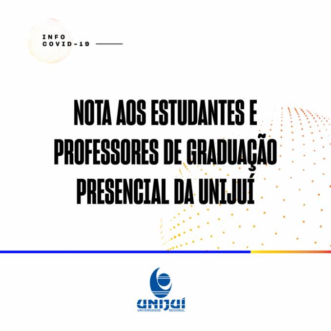 Considerando a Portaria MEC nº 544/2020, publicada no dia 17/06/2020, que autorizou a substituição das disciplinas presenciais por atividades online até 31 de dezembro de 2020, bem como o Plano de Distanciamento Controlado implantado no Estado do Rio Grande do Sul, autorizando o retorno ao presencial apenas dos estágios e das atividades práticas de laboratório de pesquisa e ensino, vimos informar aos estudantes da Unijuí o que segue: