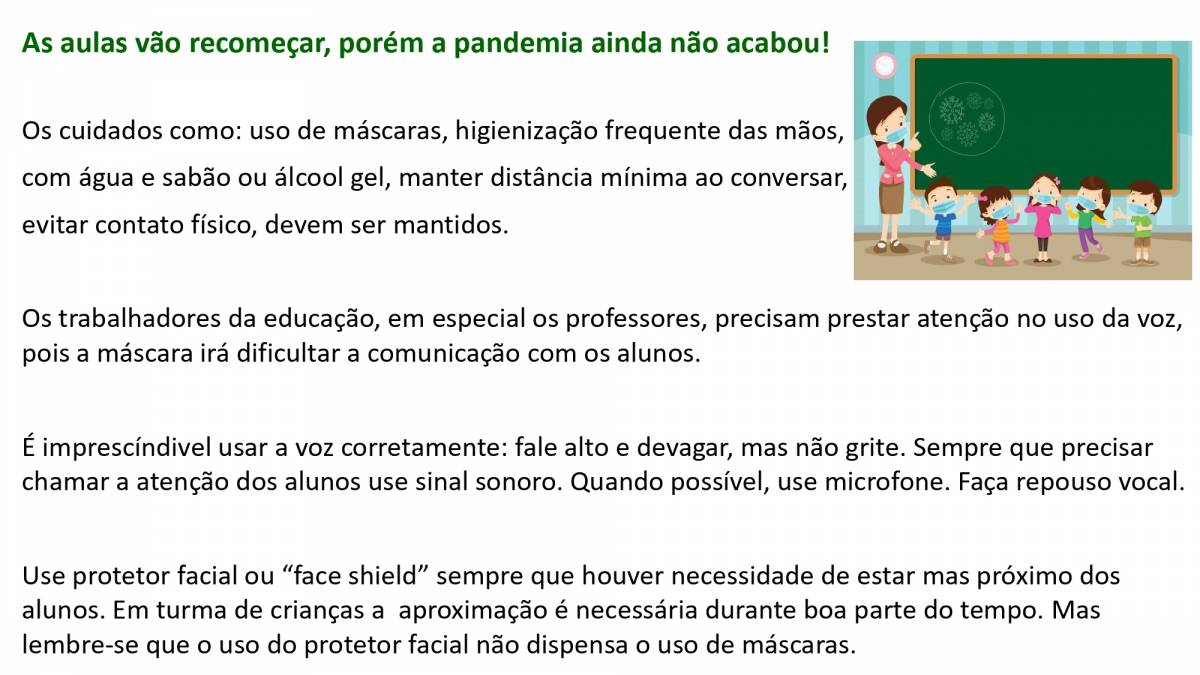 - As atividades práticas e os estágios presenciais externos também são permitidos, de acordo com a manutenção do campo de estágio, seguindo os protocolos de cada local.