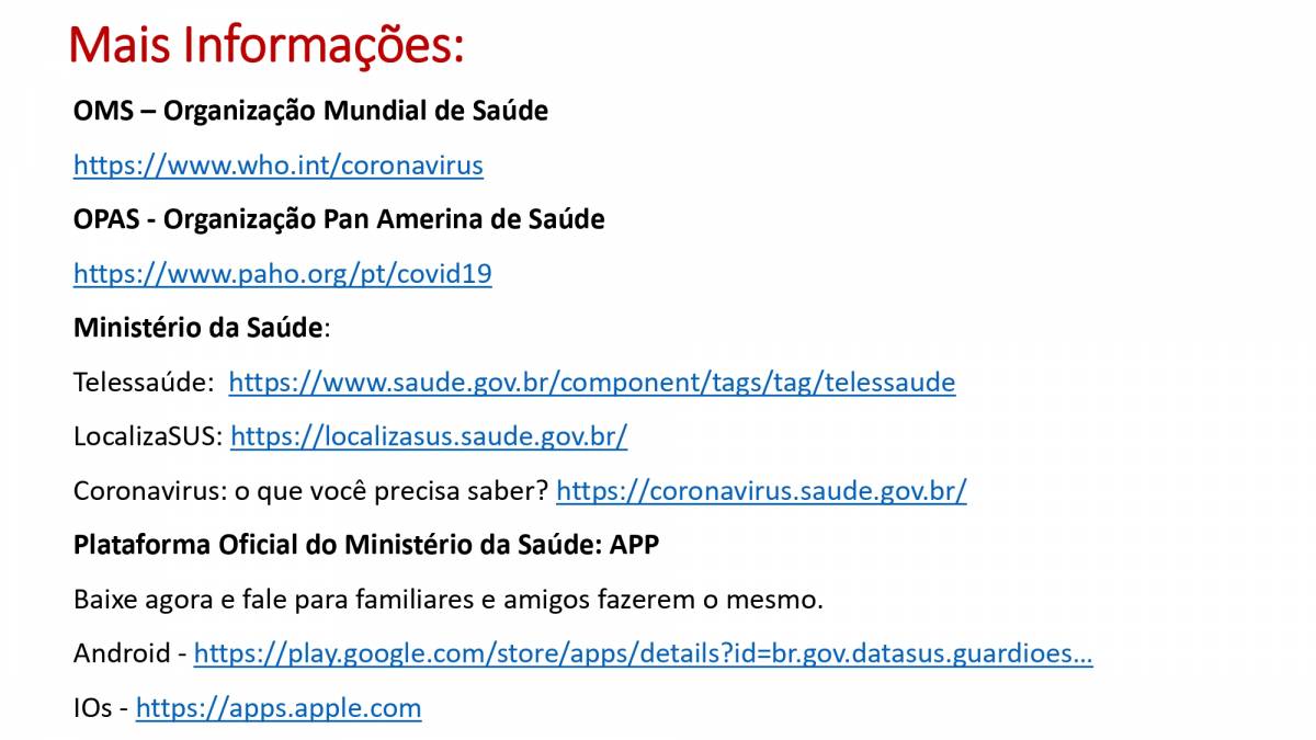 Mais informações e/ou atualizações sobre a COVID-19 podem ser obtidas no link: https://www.saude.gov.br/saude-de-a-z/coronavirus