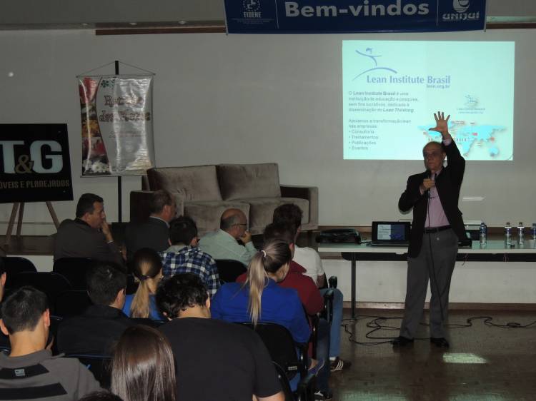 Em sua fala, o palestrante mostrou os fatos e pessoas envolvidas no desenvolvimento histórico do modelo de produção enxuta (lean), além de mostrar como ele funciona e é adotado em indústrias e empresas mundo afora, entre outros aspectos.