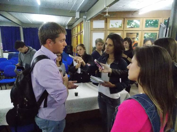 A prática de uma cobertura de evento foi a atividade realizada na disciplina de Radiojornalismo I na noite de terça, 29 de abril. Vinte alunos, orientados pela Professora Vera Raddatz, se integraram aos do Curso de Administração no Salão Azul da UNIJUÍ. A partir da pauta Momento Empreendedor, eles captaram informações para produção de notícias curtas, boletins, enquetes e entrevistas para rádio. Divididos em cinco grupos assistiram à palestra de Jean Carlo Robinson que falou sobre sua experiência como empresário do setor de painéis de led, interagiram com os alunos e professores do Curso de Administração realizando enquetes, cujo foco foi o conteúdo da palestra, e também entrevistaram o palestrante. O resultado dessa captação de material será um programa de radiojornalismo produzido pela turma. “Considero muito importante essas experiências práticas fora da sala de aula, em que os futuros profissionais podem aplicar concretamente os fundamentos recebidos em aula. É neste momento que eles compreendem a importância não só dos conteúdos teóricos e técnicos, mas a ética, a responsabilidade e o caráter social da comunicação”, destacou a professora Vera Raddatz.