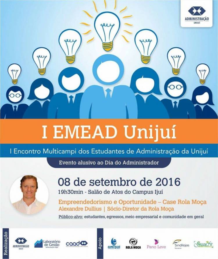 Nesta quinta-feira, 08 de setembro, acontece o I Encontro Multicampi dos Estudos de Administração da Unijuí - EMEAD, em comemoração ao dia do Administrador. O Encontro é promovido pelo Curso de Administração em pareceria com o Sindilojas e será realizado no Salão Azul da Biblioteca do Campus Ijuí.