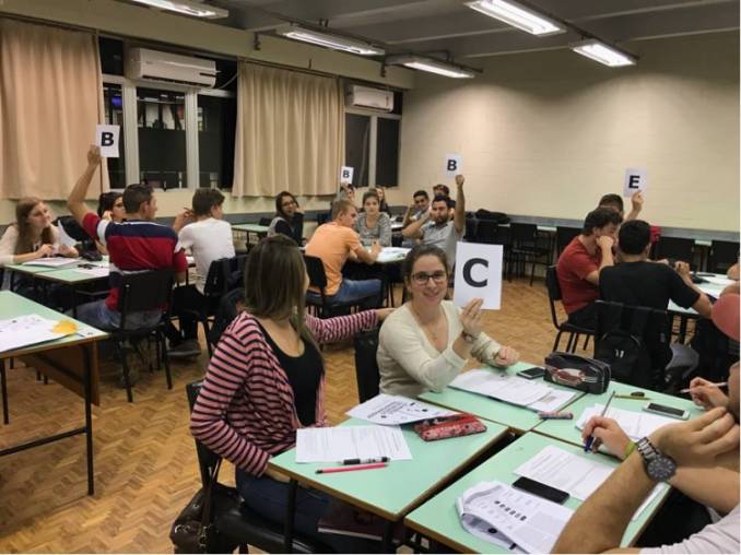 Após a atividade individual, os alunos são reunidos em equipes e discutem cada questão, buscando chegar a uma decisão conjunta sobre a melhor resposta. Após a discussão com a equipe, os participantes são encorajados a se posicionarem diante de toda a turma com a alternativa escolhida por cada time, permitindo com isso um debate que envolve todos os acadêmicos.