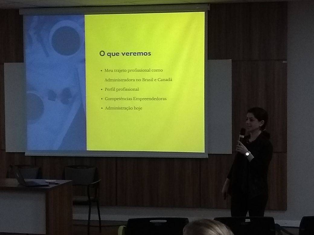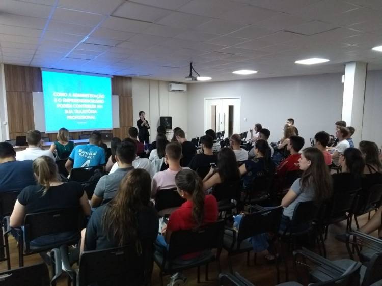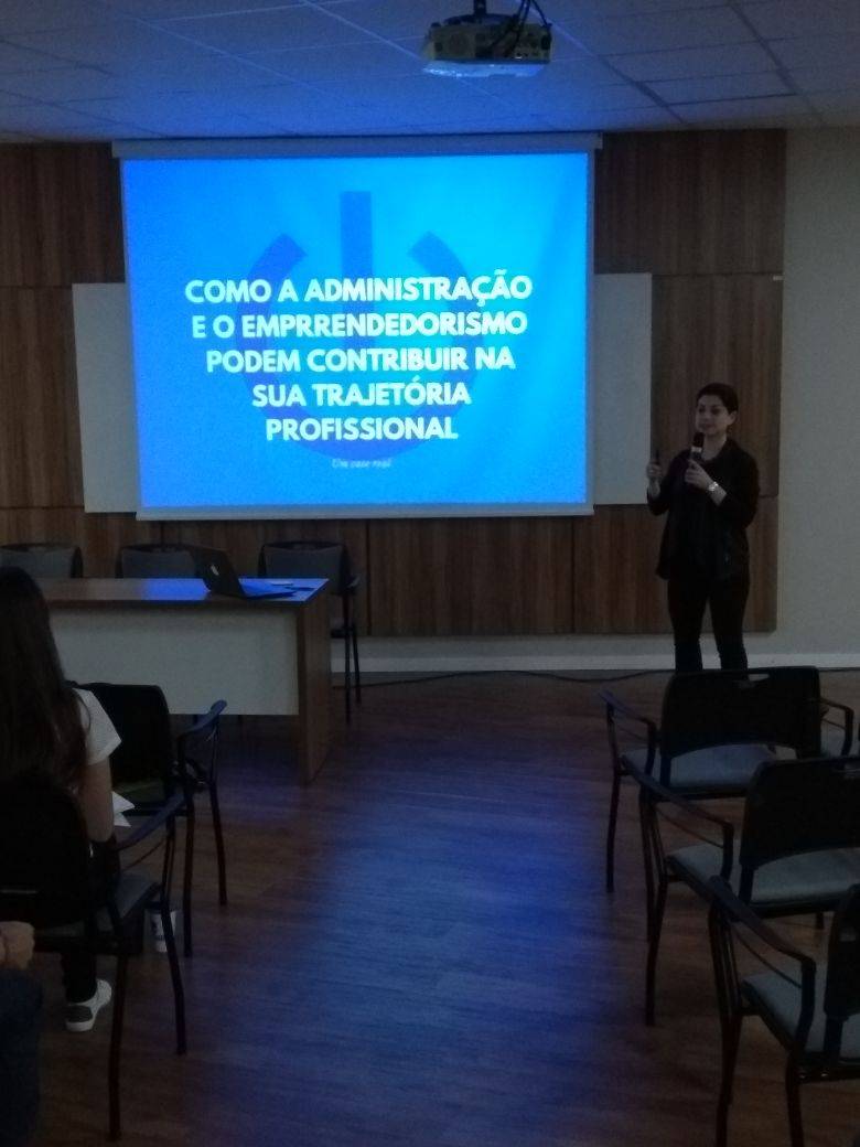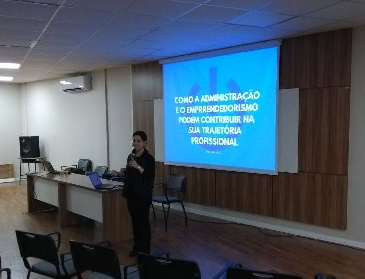 Já na terça-feira, 27, Narjara participou da aula da disciplina de Administração Empreendedora, que neste semestre está sendo conduzida pela professora Fernanda Pasqualini. A disciplina de Administração Empreendedora é responsável por apresentar aos calouros o curso e a Universidade, apoiada na temática do empreendedorismo e das competências do Administrador. Nesse sentido, Narjara conduziu um bate-papo sobre o tema “Conhecimentos, habilidades e atitudes do empreendedor e Administrador”, compartilhando com os acadêmicos a sua trajetória enquanto estudante e profissional. Foi uma aula diferenciada e muito produtiva, onde os acadêmicos calouros puderam ter um primeiro contato com algumas ferramentas como a matriz SWOT e planejamento 5W2H norteados pelas competências fundamentais a serem desenvolvidas pelo Administrador.