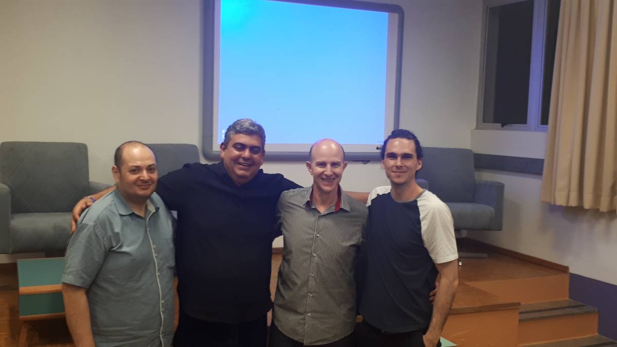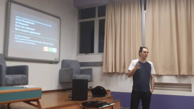 Durante a palestra, Cristiano contou sobre sua experiência no Canadá. Atualmente ele faz Ph.D. na Concórdia University, em Montreal, no grupo de pesquisa do professor Yann-Gael, na linha de Engenharia de Software para Internet of Things.
