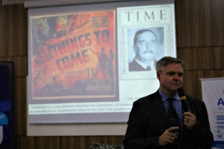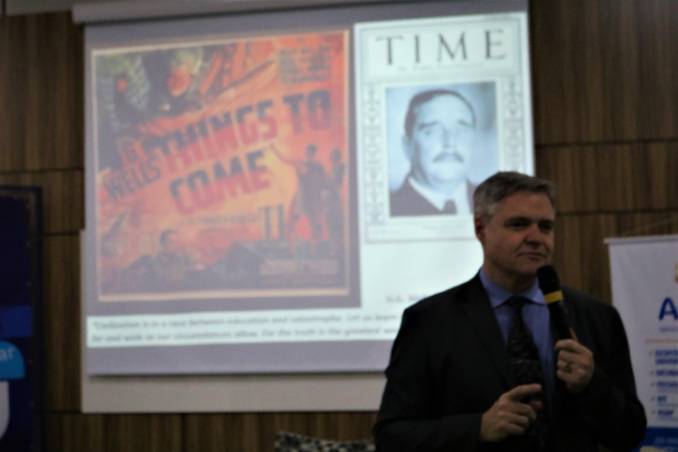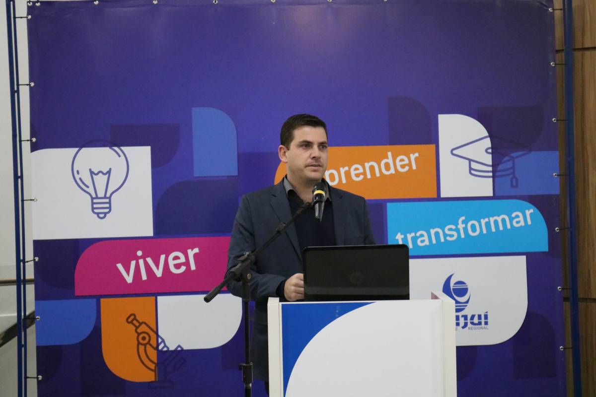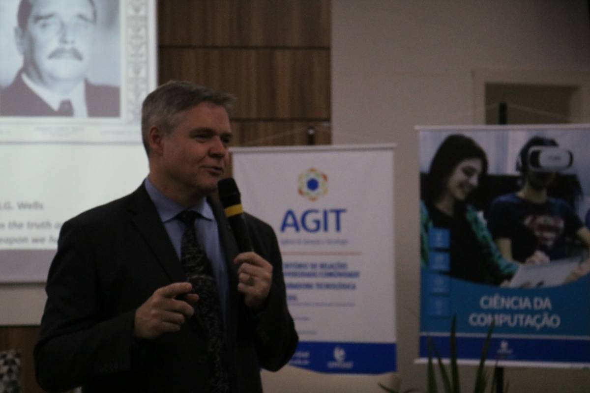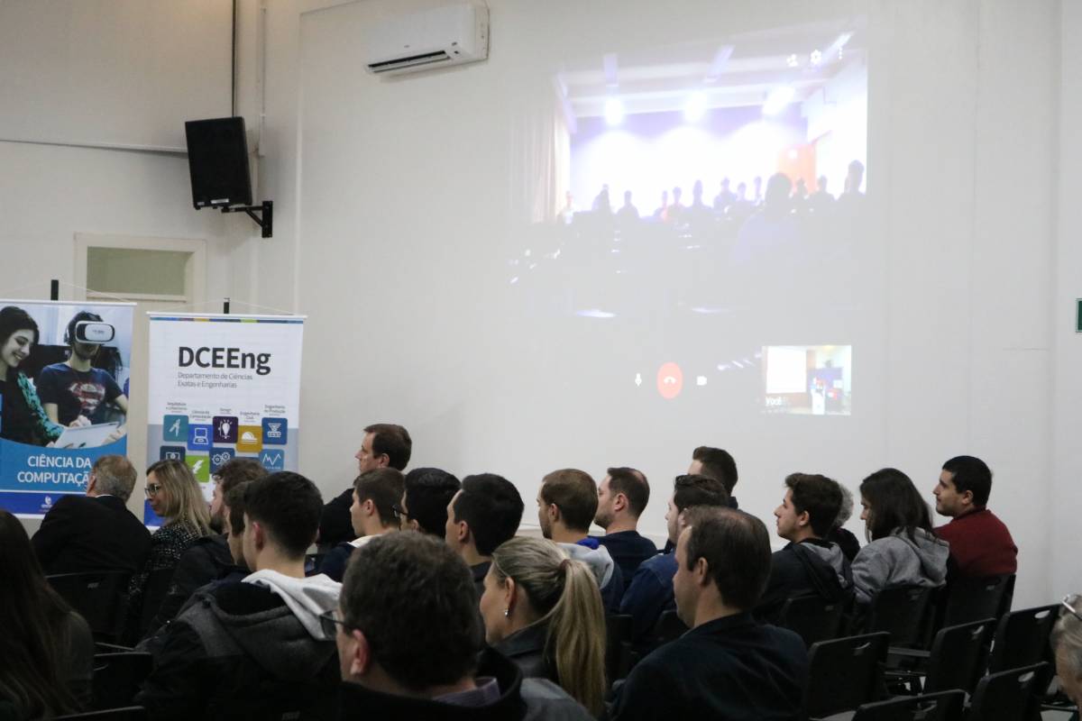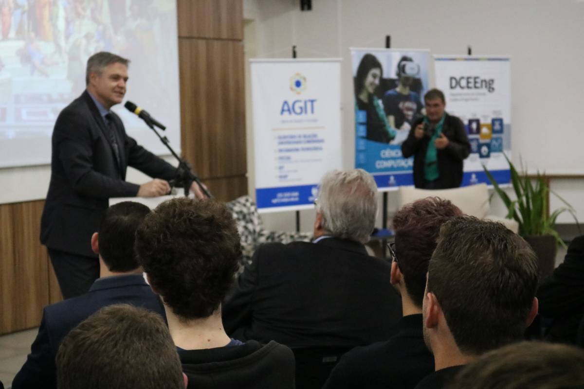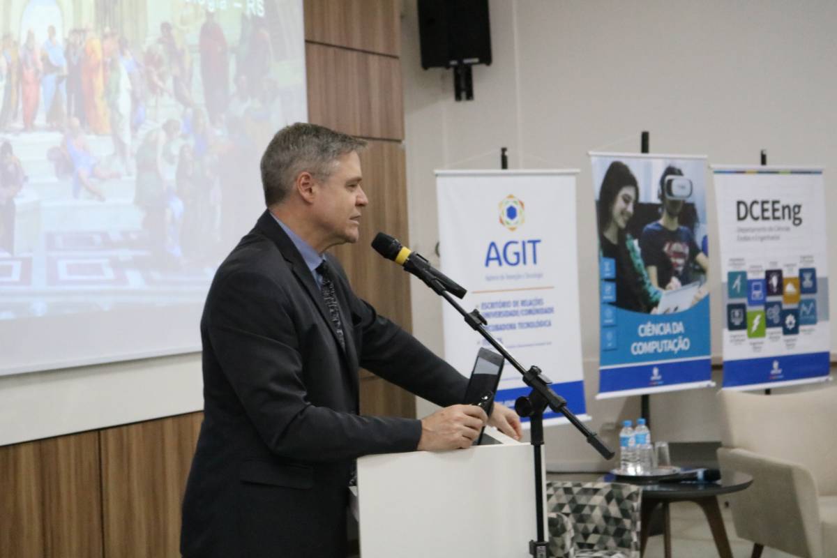 Antes da palestra com o convidado especial, fizeram as saudações institucionais a Reitora da Unijuí, Cátia Nehring e o chefe do Departamento de Ciência Exatas e Engenharias (DCEEng), Peterson Avi, além do coordenador do curso de Ciência da Computação, Edson Padoin, que conduziu os trabalhos da noite fazendo um resgate da história do curso e projetando desafios aos estudantes e profissionais da área. “A partir da utilização de Inteligência Artificial, na lógica de uma quarta revolução industrial, a computação começa a tomar postos de trabalho. Para nós, como profissionais da área, é preciso discutir esta questão e suas implicações, pois, o que vai acontecer daqui para frente, vai afetar o mundo de forma significativa. Como vamos nos preparar para isto?”, questionou.