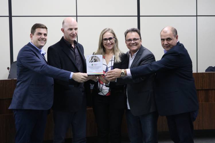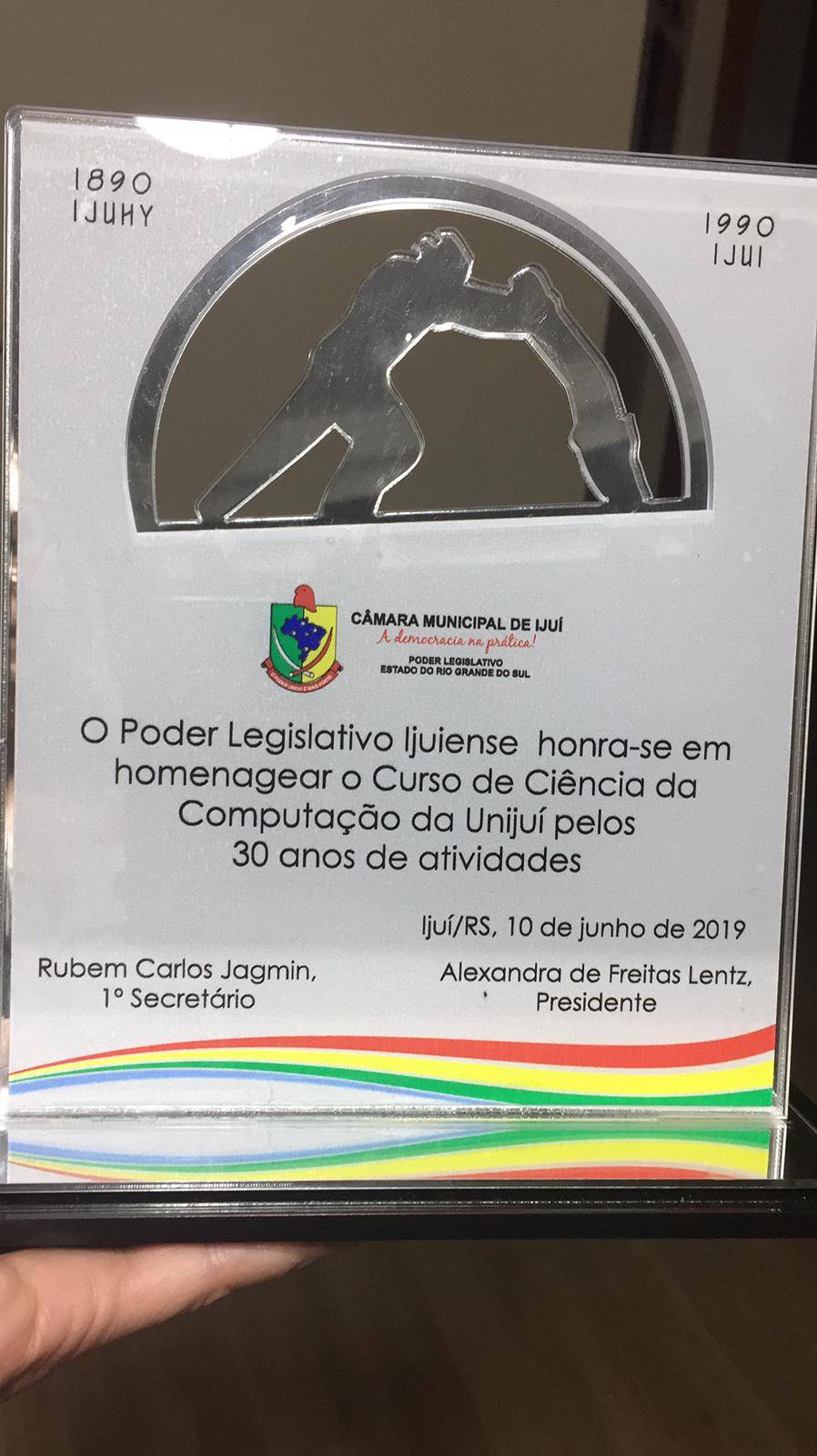 O curso de Ciência da Computação da Unijuí recebeu, nesta segunda-feira, 10 de junho, homenagem na Câmara de Vereadores de Ijuí pelos 30 anos de atuação. Com proposição do vereador Cesar Busnello, foi entregue uma placa comemorativa na sessão desta semana. Participaram do momento a Reitora, Cátia Maria Nehring, o chefe do Departamento de Ciência Exatas e Engenharias (DCEEng), Peterson Avi, e o coordenador do curso, professor Edson Padoin.
