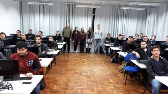 As alunas da Escola Tiradentes, Eduarda Schreiber, Brenda Schussler e Laura Schmitt, que foram selecionadas pelo Google, a partir de suas notas do ENEM, e conheceram as sedes da empresa em Belo Horizonte, Minas Gerais, conversaram com os estudantes do Curso de Ciência da Computação da Unijuí.