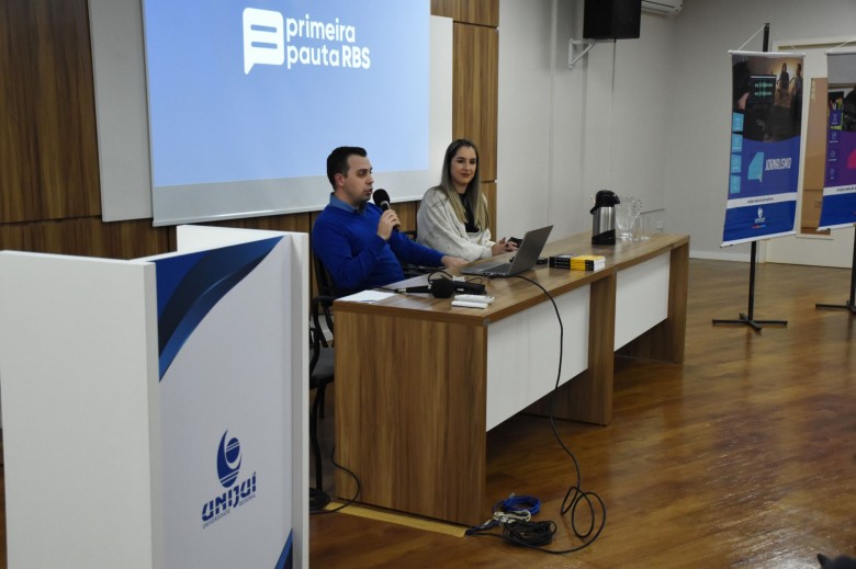 Estudantes dos cursos de Jornalismo e Publicidade e Propaganda da Unijuí participaram, nesta quarta-feira, 7 de agosto, do evento “Primeira Pauta”, que é um ciclo de palestras com a temática “Tua História Onde o Jornalismo Acontece”, promovido pelo Grupo RBS. A atividade teve como convidados os jornalistas Mateus Rodighero e Tamires Hanke.