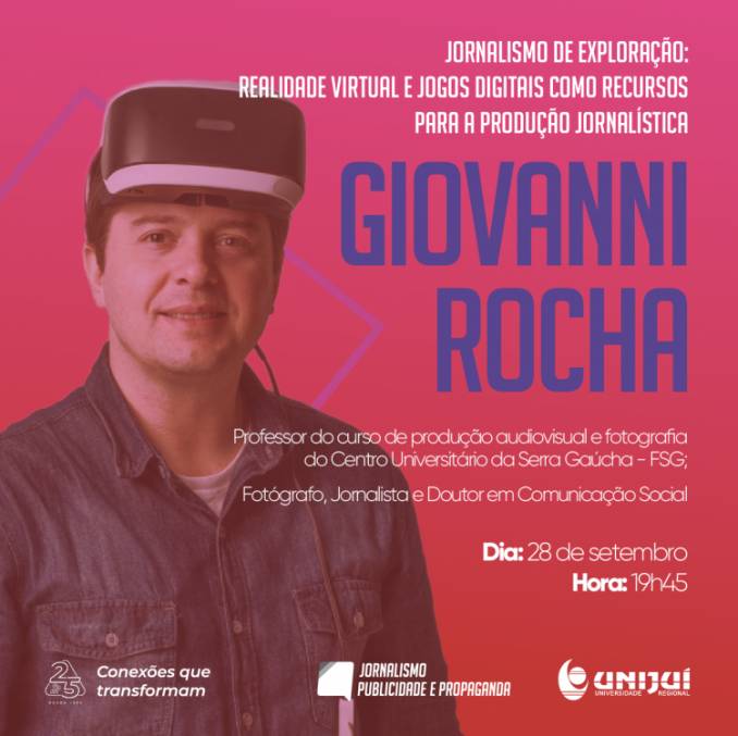 A utilização de realidade virtual e jogos digitais na comunicação social será tema de palestra realizada nesta segunda-feira, dia 28, com o professor doutor Giovanni Rocha – especialista em experiências com novos modelos narrativos em ambientes simulados a partir de dispositivos de realidade virtual. A atividade será transmitida ao vivo, a partir das 19h45, no canal do YouTube da Unijuí, integrando as comemorações de 25 anos do Curso de Comunicação Social da instituição (Jornalismo, Publicidade e Propaganda e Relações Públicas). A previsão de duração da atividade é de uma hora e meia, entre fala e debate posterior à palestra.