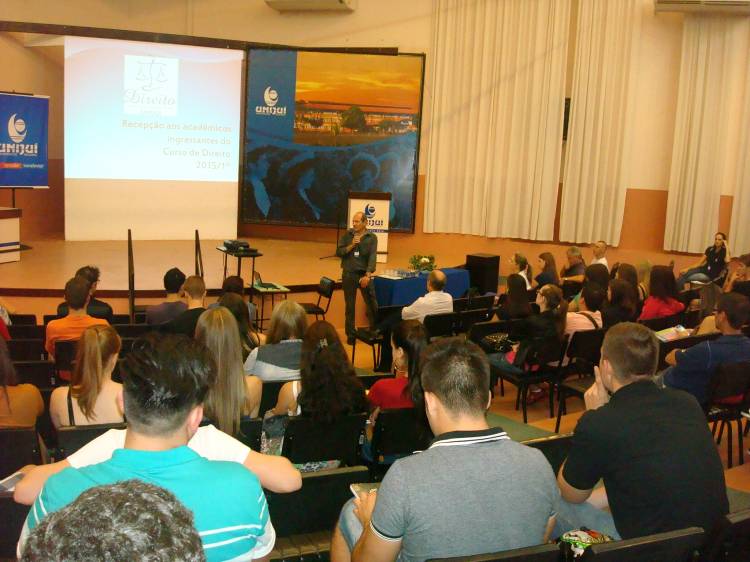 Os estudantes do curso de Direito da UNIJUÍ Câmpus Santa Rosa participaram de recepção dos calouros, na noite de quarta-feira, dia 11, no Auditório Central da Universidade. O encontro foi organizado pela Coordenadora do curso, professora Francieli Formentini com o objetivo de formalizar o início das atividades letivas e levar informações referentes a vida acadêmica dos estudantes.