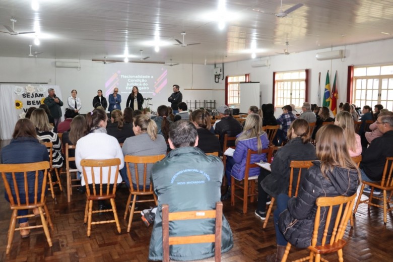 Na tarde da última quarta-feira, 14 de junho, aconteceu no Centro Cultural de Novo Machado a palestra “Aspectos práticos da regularização da nacionalidade a partir do direito brasileiro e do direito internacional”. O evento foi promovido pela Secretaria Municipal da Saúde e Assistência Social, Rede Bem Cuidar e Prefeitura Municipal de Novo Machado, e contou com a presença da coordenadora do curso de Direito do campus Santa Rosa, professora Fernanda Serrer, do professor do curso, professor Tiago dos Santos da Silva, e da advogada do Escritório Modelo, Simoni Strongalli.