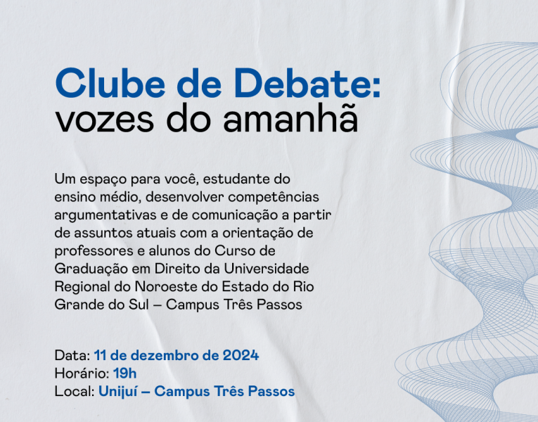 O curso de Direito - campus Três Passos realiza, na próxima quarta-feira, 11 de dezembro, o evento Clube de Debate: Vozes do Amanhã. A atividade é voltada a estudantes do Ensino Médio, com o objetivo de desenvolver competências argumentativas e de comunicação a partir de assuntos atuais com a orientação de professores e estudantes do curso de Graduação.