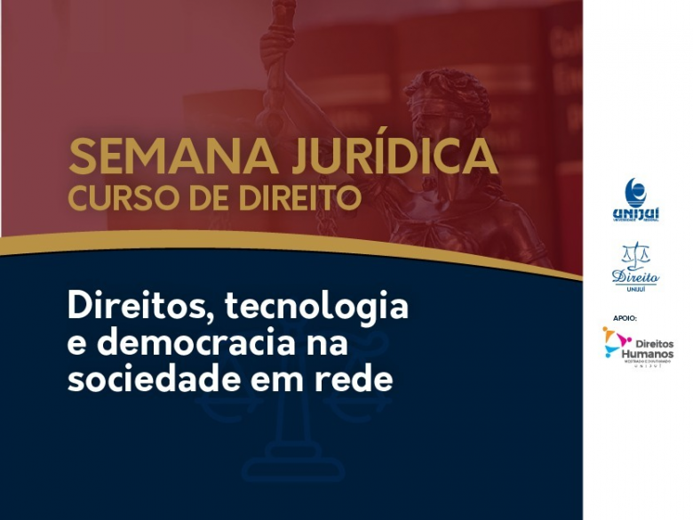 “Direitos, tecnologia e democracia na sociedade em rede” é o tema da Semana Jurídica do curso de Direito, que acontecerá entre os dias 18 e 21 de maio, com transmissão pelo canal do Youtube do Programa de Pós-Graduação em Direito da Unijuí. O evento acontece das 19h30 às 22h30.