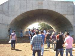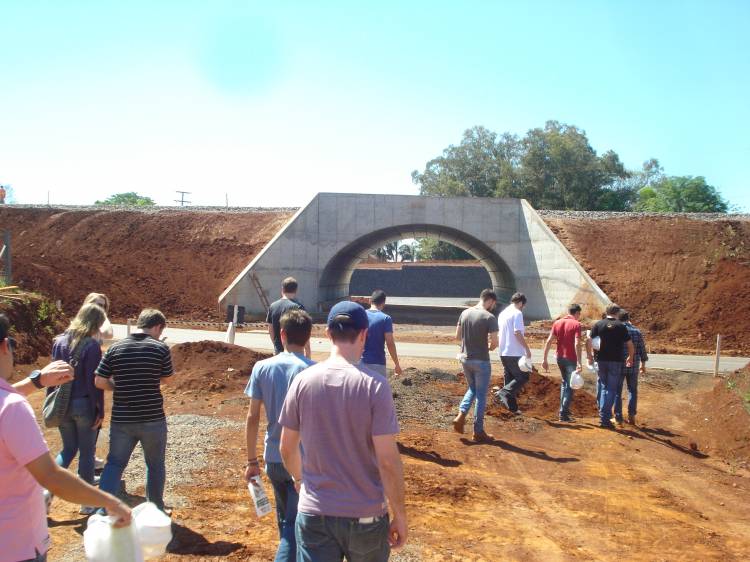 Além da passagem inferior e da pavimentação os alunos puderam acompanhar a execução de serviços complementares como a drenagem pluvial e os muros de contenção de gabiões, tipo de gaiola preenchida com pedras.