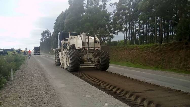 A segunda solução de pista consistia na reciclagem do pavimento existente numa profundidade de 20cm com adição de cimento. Para isto é utilizada uma máquina chamada recicladora que tritura o pavimento existente resultando em um material que servirá de base, após a compactação para o novo revestimento. Após alguns dias é executado o concreto asfáltico tradicional.