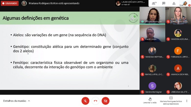 Em sua fala, a palestrante abordou a Farmacogenética, estudo de como a genética influencia na variação interindividual da resposta ao uso de fármacos. “A ideia central foi debater o impacto das variantes genéticas nas respostas aos medicamentos, abordando o que já se tem, de fato, possível de implementação clínica. Quando escutamos falar de Farmacogenética, a maioria das pessoas têm uma ideia relacionada apenas à pesquisa. Então, o objetivo é mostrar justamente o contrário, e que já existem ferramentas para utilizarmos estes dados na parte clínica”, explicou Mariana.