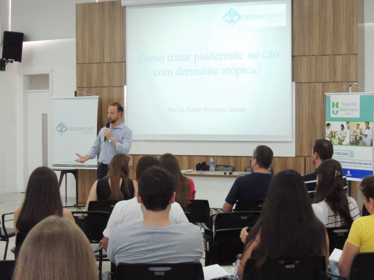O tema da palestra, dermatite atópica em cães, doença mais atendida na clínica de pequenos animais, é uma enfermidade de caráter alérgico com grande casuística em cães de pequeno porte e de raça pura que vivem principalmente em ambientes intradomiciliares. “Por se tratar de uma doença crônica e recorrente, a estimativa hoje é que em torno de 80 a 100% dos cães com dermatite atópica desenvolvam infecções bacterianas na pele, tecnicamente chamada de piodermite”, comenta o professor.