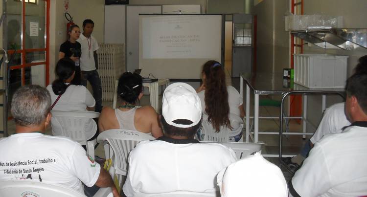 Os estagiários de Alimentação Institucional do curso de Nutrição da UNIJUÍ realizaram oficina de Boas Práticas em Alimentação para os manipuladores de alimentos do Banco de Alimentos da Secretaria Municipal de Assistência Social, Trabalho e Cidadania de Santo Ângelo. O Banco de Alimentos é coordenado pela nutricionista Rosana Friedrich, tendo como secretária municipal Genelucia Dalpiaz. Na oficina foram trabalhados os temas sobre higiene pessoal, higiene do ambiente e dos alimentos, enfocando a importância do manipulador de alimentos na prevenção de doenças veiculadas pelos alimentos. A atividade foi coordenada pela professora Eilamaria Libardoni Vieira, envolvendo os acadêmicos Obaldo de Souza Vargas Filho e Caroline Espich.