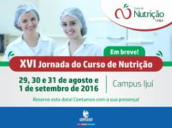 O Curso de Nutrição da Unijuí realiza nos próximos dias 29, 30, 31 de agosto e 1º de setembro a XVI Jornada do Curso de Nutrição. A programação, disponível no site da Unijuí, conta com Minicursos, Palestras e Mesa Redonda.