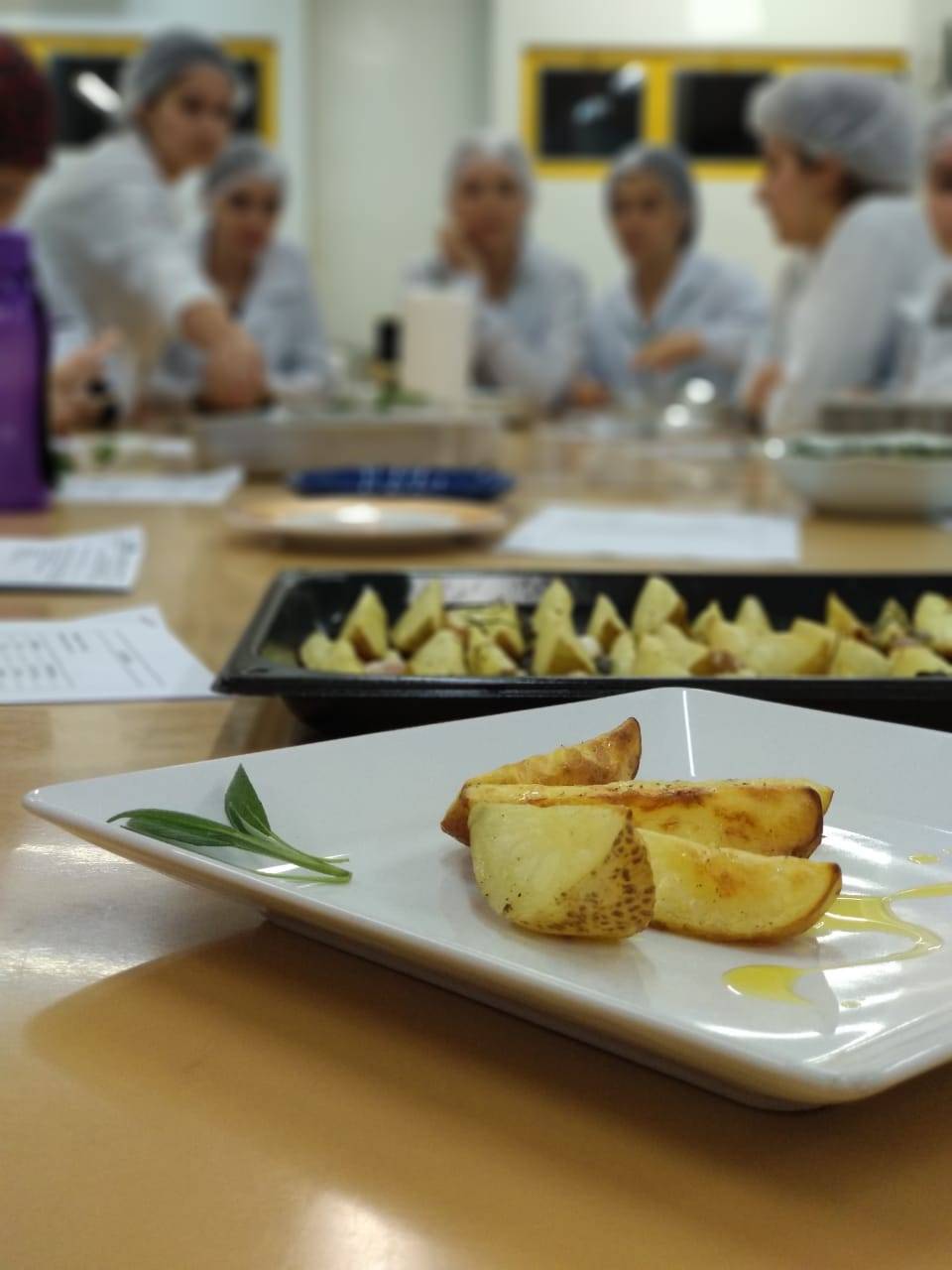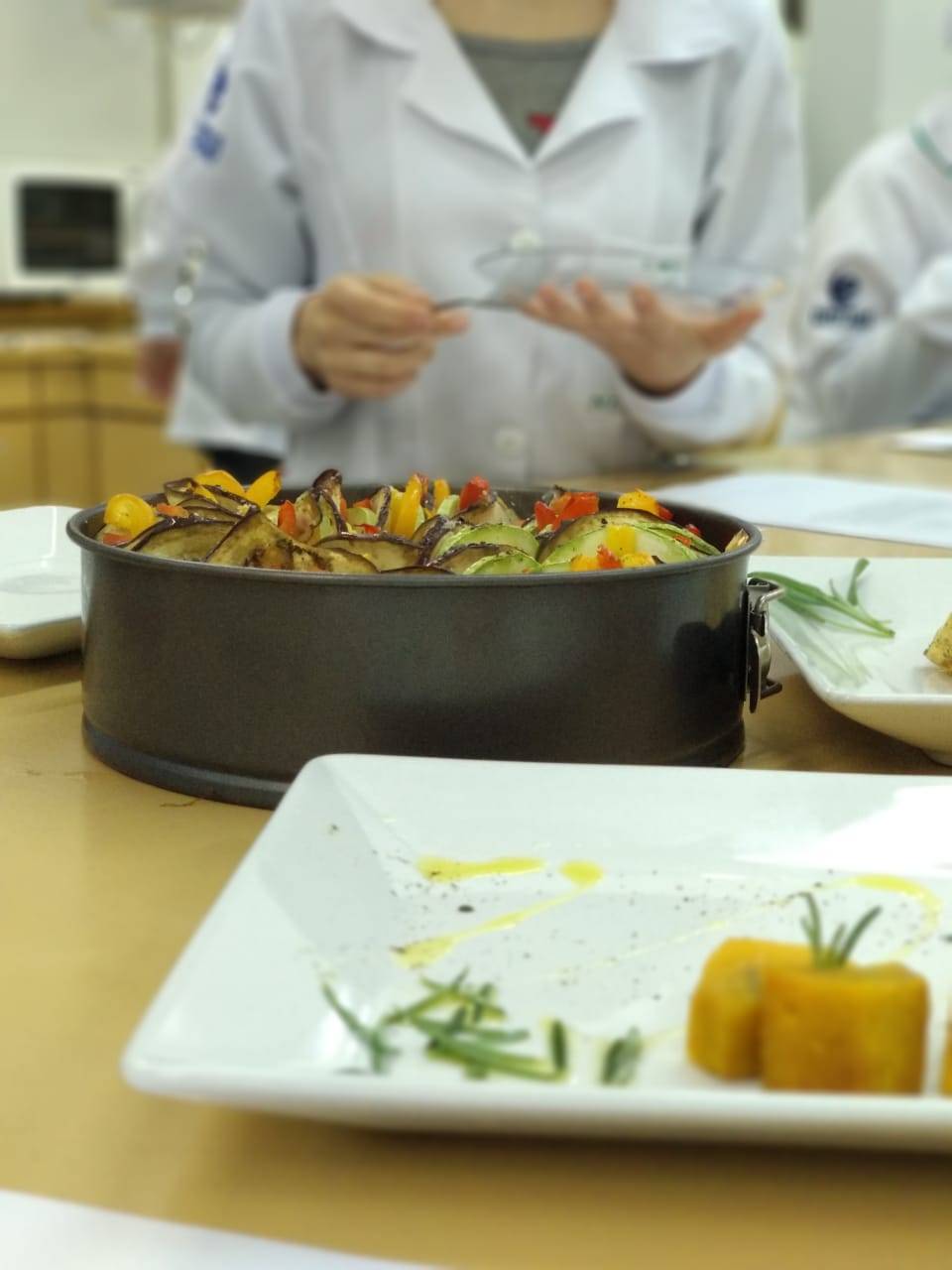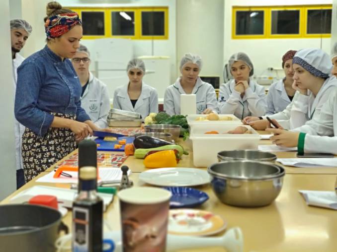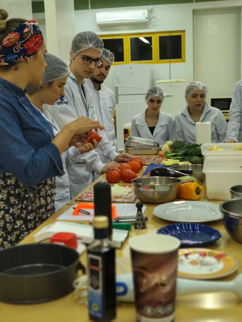 Para conhecer os cortes de hortaliças, Andressa Burmann, egressa do curso de Nutrição e especialista em Gastronomia Aplicada a Nutrição pela Unijuí, foi convidada para uma aula prática, também no Laboratório, falando sobre hortaliças, temperos, ervas, especiarias e condimentos. Nessa noite, os alunos tiveram a oportunidade de conhecer os cortes, praticar e elaborar receitas com as hortaliças picadas à brunoiese, chifonadas, em cubos, bastonetes e outros.