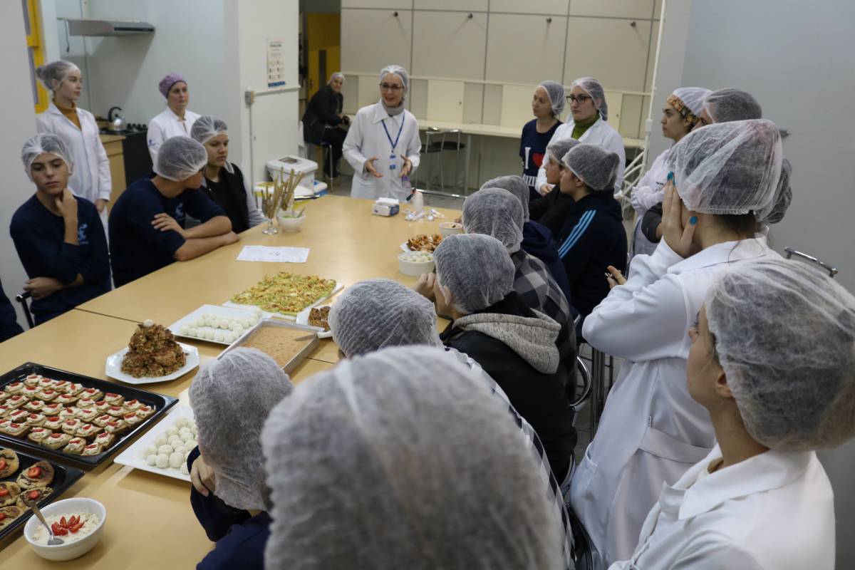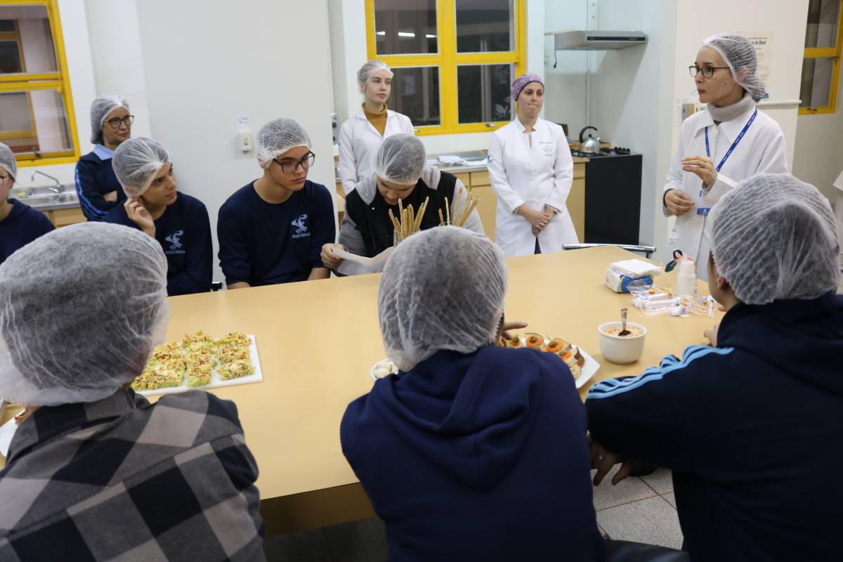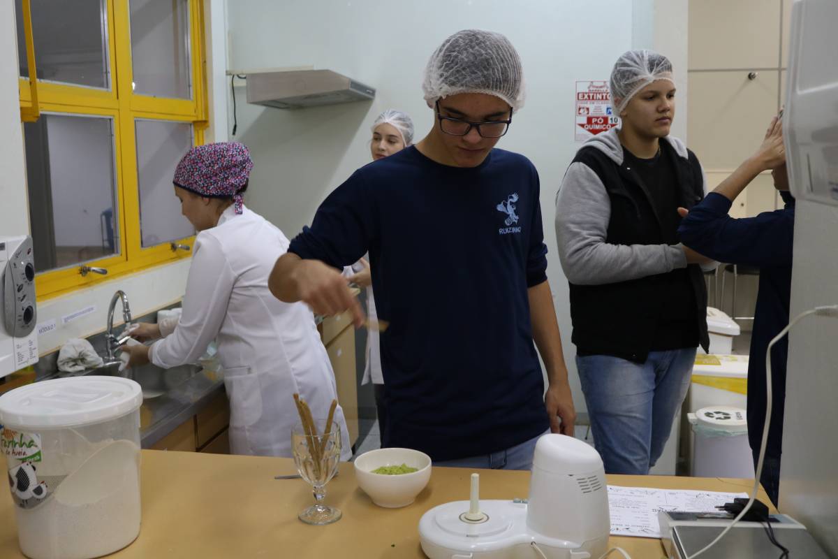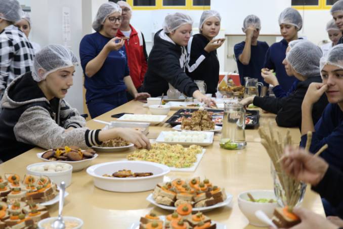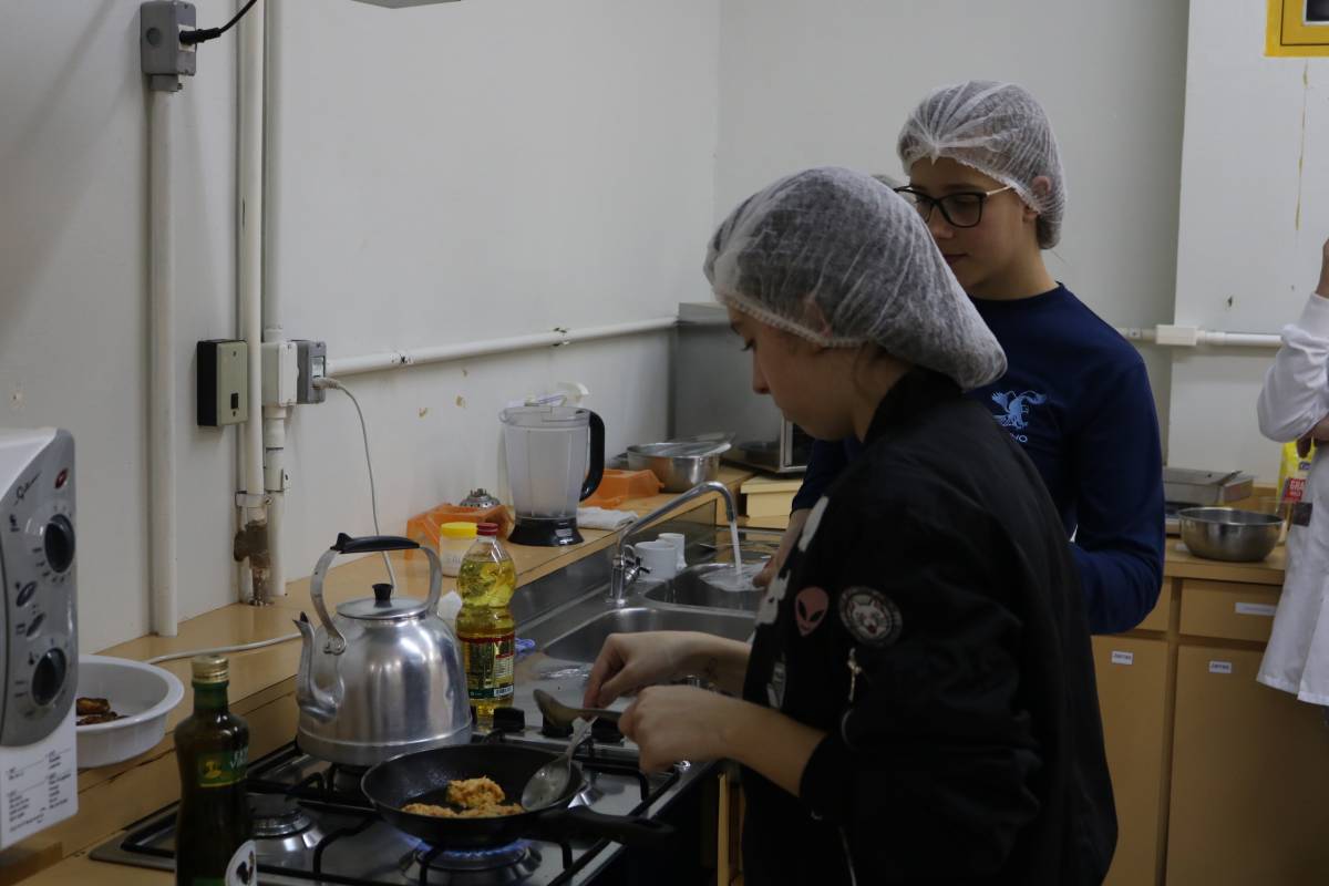 Os alunos colocaram a mão na massa, com auxílio dos universitários. “Eles interagiram com dedicação e criatividade na elaboração de preparações, as quais podem passar a compor o cardápio dos jovens daqui para a frente”, salienta a professora da disciplina, Karina Rios.