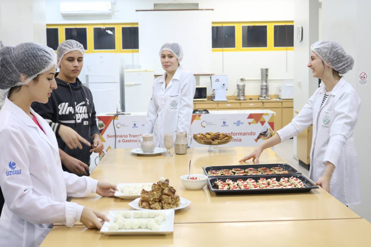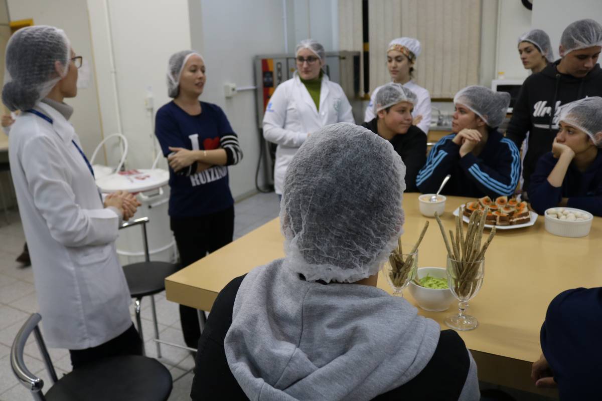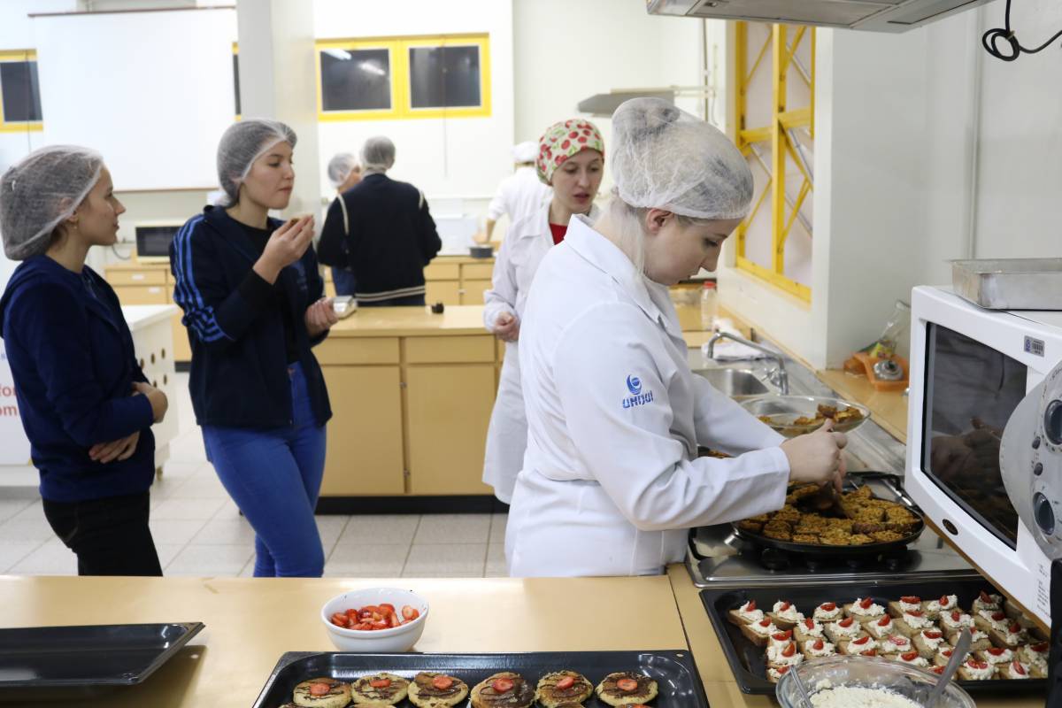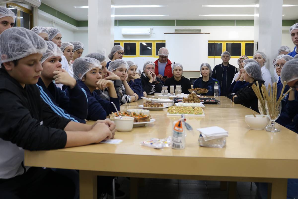 Os alunos colocaram a mão na massa, com auxílio dos universitários. “Eles interagiram com dedicação e criatividade na elaboração de preparações, as quais podem passar a compor o cardápio dos jovens daqui para a frente”, salienta a professora da disciplina, Karina Rios.