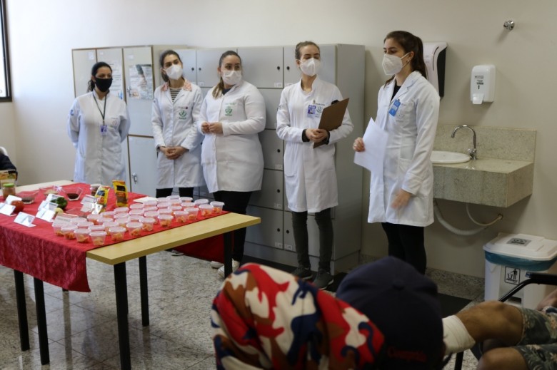 Após as explanações sobre o tema, o grupo de estudantes ofereceu aos pacientes uma combinação nutritiva para degustar, formada por mamão, mel e aveia. Enquanto os pacientes provavam os alimentos, as estudantes sanaram dúvidas que surgiram durante a conversa.