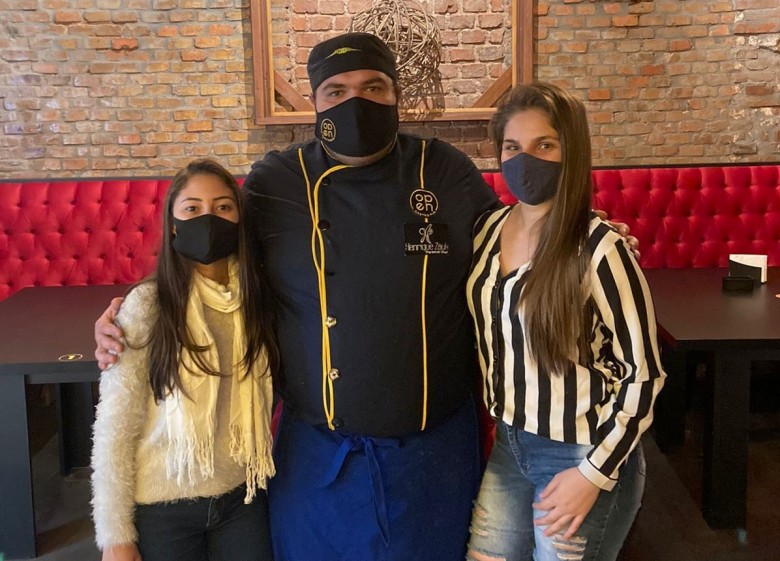 As acadêmicas Daniela Pinheiro e Elidieli Sandri Noro, com o chef Henrique Zaukn, em visita ao Open Rock Gastropub
