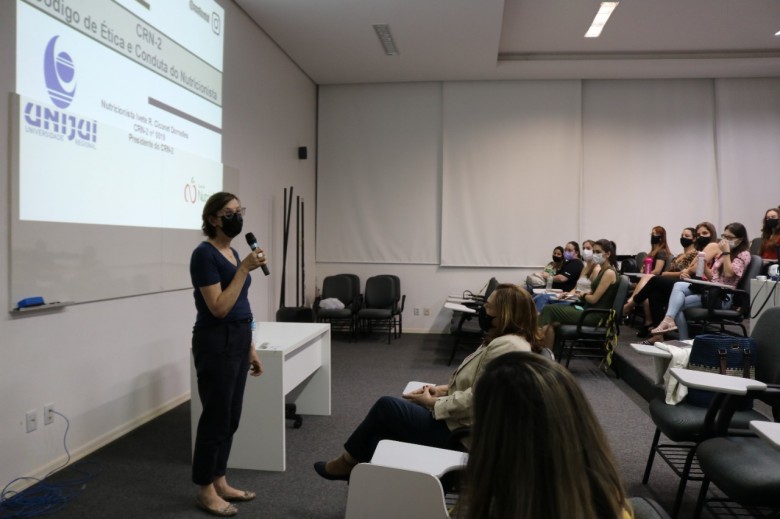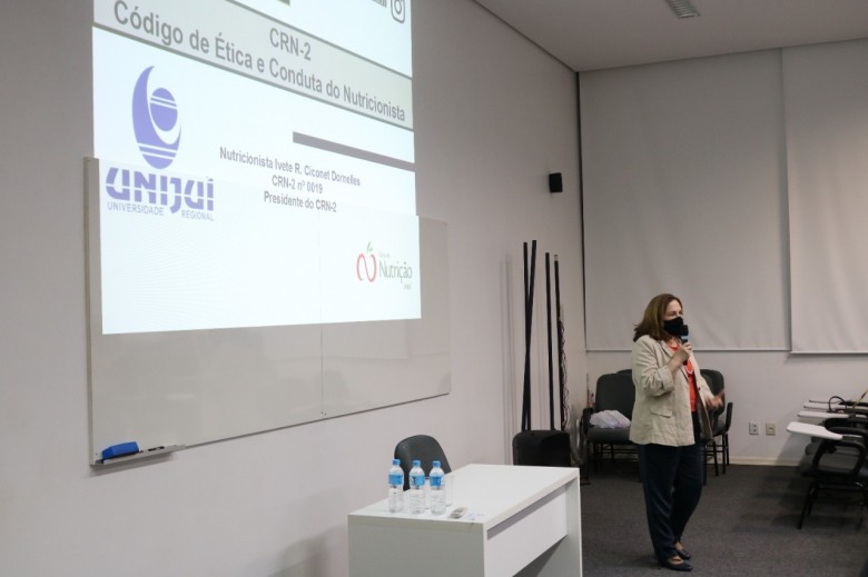 O curso de Nutrição da Unijuí promoveu nesta segunda-feira, 8 de novembro, uma palestra com o tema “Ética e Conduta do Nutricionista”, no auditório do Hospital Veterinário. Acadêmicos e egressos puderam conferir a palestra com a presidente do Conselho Regional de Nutricionistas - 2ª Região (CRN2), Ivete Regina Ciconet Dornelles.