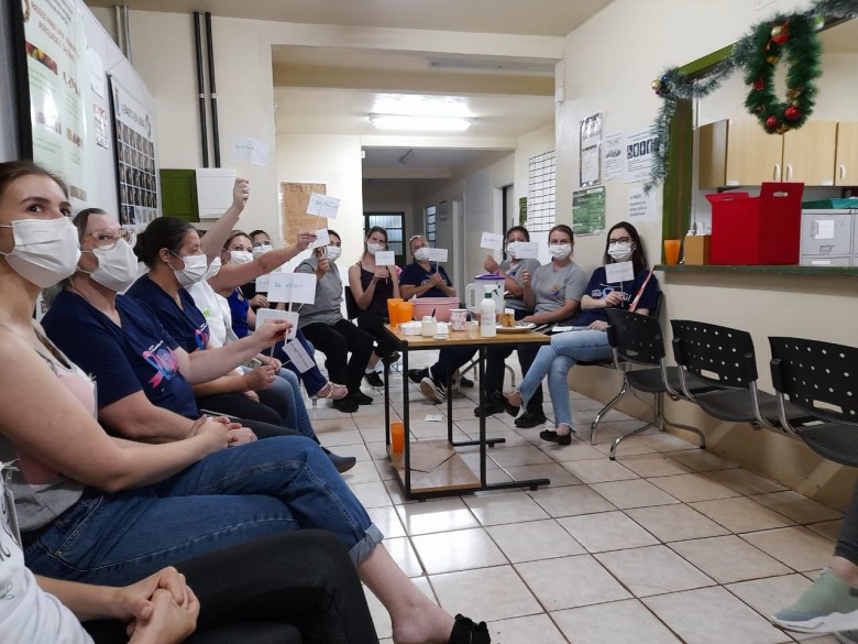 Um grupo de estudantes do estágio de Nutrição em Saúde Coletiva II realizou, na última semana, uma ação presencial com a equipe da Estratégia de Saúde da Família (ESF) do bairro Thomé de Souza, de Ijuí. A atividade de educação permanente teve como temática "Guia Alimentar como ferramenta de alimentação saudável e adequada". Os acadêmicos trabalharam, em um primeiro momento, questões ligadas à alimentação afetiva, uma dinâmica que remeteu a diversas lembranças da equipe sobre preparos culinários que eram oferecidos na infância.