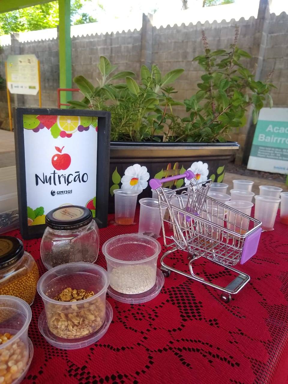 Nesta manhã desta sexta-feira, dia 30, os estudantes do Curso de Nutrição da Unijuí que realizam o Estágio em Saúde Coletiva II na ESF 14/15 do Getúlio Vargas, em Ijuí, realizaram ações de educação em saúde ao ar livre. Foi organizado um espaço para orientação individualizada e outro para orientações sobre o uso de condimentos naturais, representação da ingestão de açúcar e sobre o consumo de alimentos industrializados e bebida alcoólica.