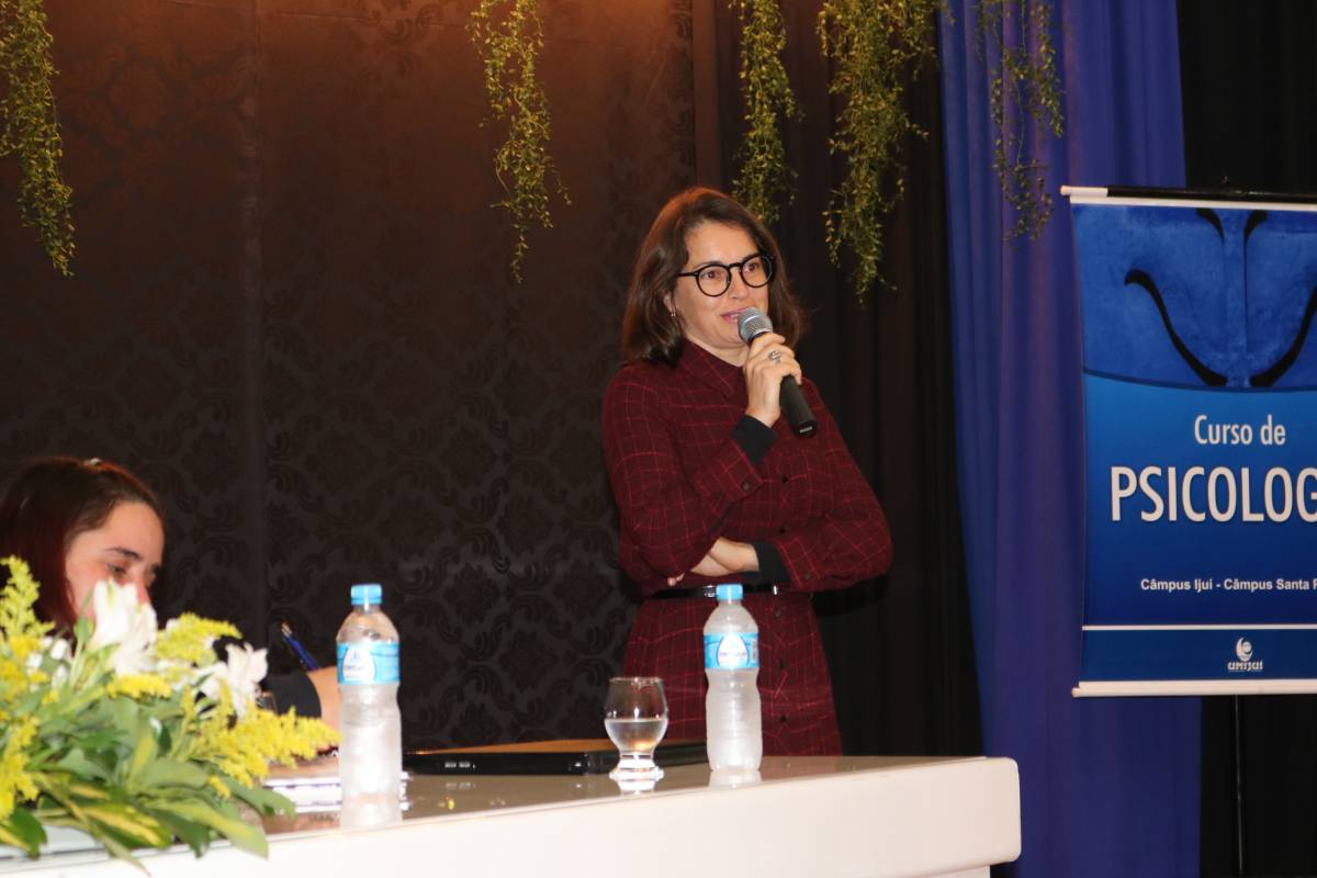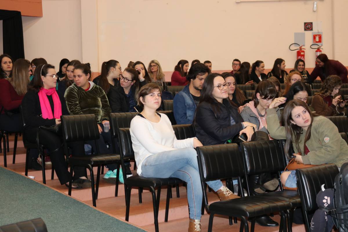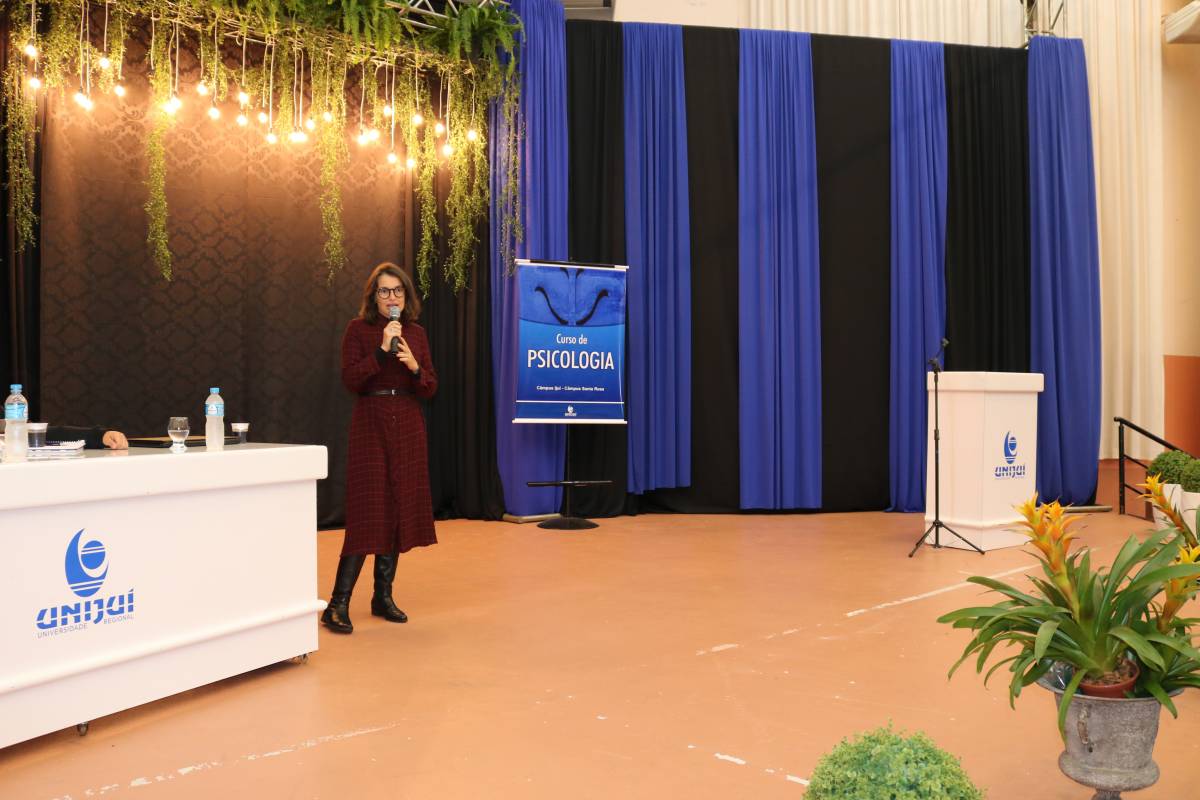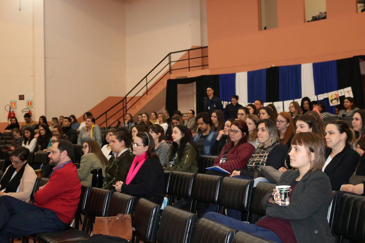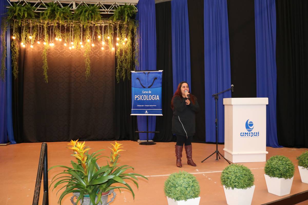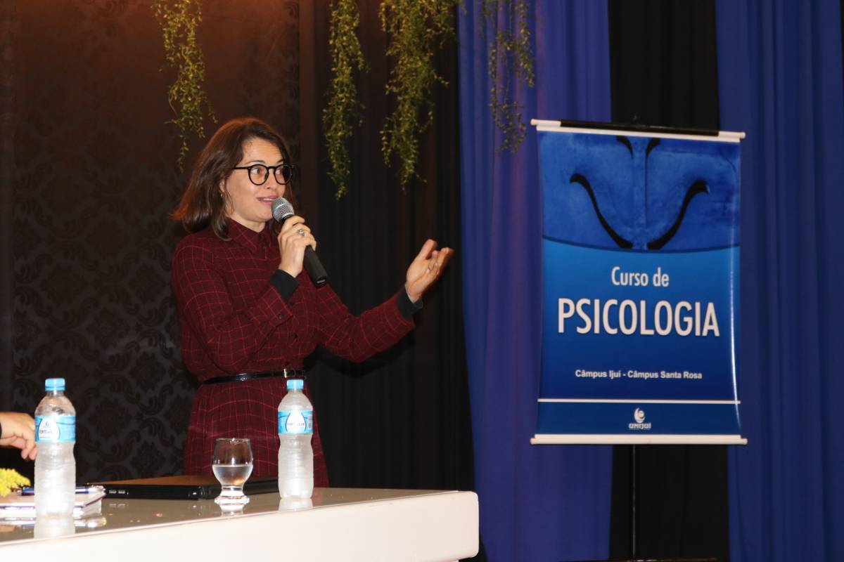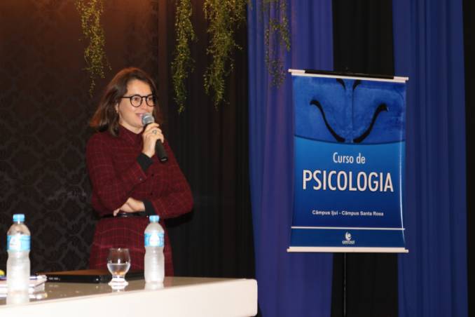 A Semana Acadêmica do curso de Psicologia teve abertura das atividades na noite de segunda-feira, dia 26, no campus Santa Rosa, com a presença da egressa do curso e psicóloga Fabiane Angelita Steinmetz, que abordou a temática "A função do cuidador no processo de subjetivação dos bebês que frequentam escolas de educação infantil" e a experiência no VI Congresso Internacional Transdisciplinar sobre o Bebê, em Paris na França. Fabiane destacou a importância do lugar dos profissionais que acolhem os bebês na educação infantil. “O lugar dos profissionais é de maternagem, aconchego e subjetivação, visto que os bebês passam parte significativa do dia com eles. É importante que possamos olhar para esses profissionais com o valor que lhes cabe, enfatizando sua importância na vida dos bebês. Que eles possam ter orgulho legítimo de participar da constituição psíquica dos bebês”, afirma a psicóloga.