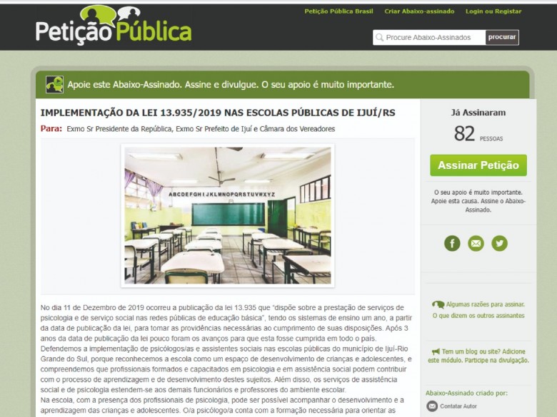 Conforme descrito, a petição defende a implementação de psicólogos e assistentes sociais nas escolas públicas do município, reconhecendo a escola como um espaço de desenvolvimento de crianças e adolescentes, e compreendendo que profissionais formados e capacitados em psicologia e em assistência social podem contribuir com o processo de aprendizagem e de desenvolvimento destes sujeitos. Além disso, os serviços de assistência social e de psicologia estendem-se aos demais funcionários e professores do ambiente escolar.
