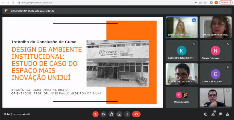 Com o título “Design de Ambiente Institucional: Estudo de Caso do Espaço Mais Inovação Unijuí”, o TCC foi defendido nesta segunda-feira, dia 12 de dezembro. A ideia do projeto surgiu a partir de uma demanda lançada ao curso de Design pelo coordenador do Espaço + Inovação, Peterson Avi. “O pedido foi que a Sala de Ideação fosse realmente um ambiente que inspirasse a criatividade e as novas ideias das pessoas. E foi isso que a Dara entregou para nós. Ficamos muito contentes com o projeto que ela apresentou, que deu cor e vida ao local”, afirma o professor.