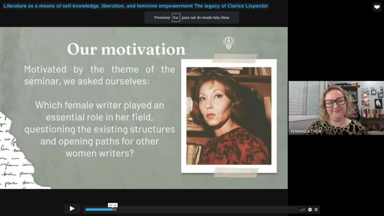 O tema da conferência, promovida pela Tomorrow People Organization, foi “Inovação, iluminação e integração”, assunto que chamou a atenção das docentes, que aproveitaram para falar da herança deixada pela escritora brasileira. “Pensamos em apresentar ao mundo uma brasileira que certamente foi líder em seu campo e abriu caminho para que muitas outras mulheres não apenas escrevessem e produzissem literatura, mas se tornassem leitoras e se encontrassem refletidas nas suas escritas intimistas”, comenta a professora Fernanda.