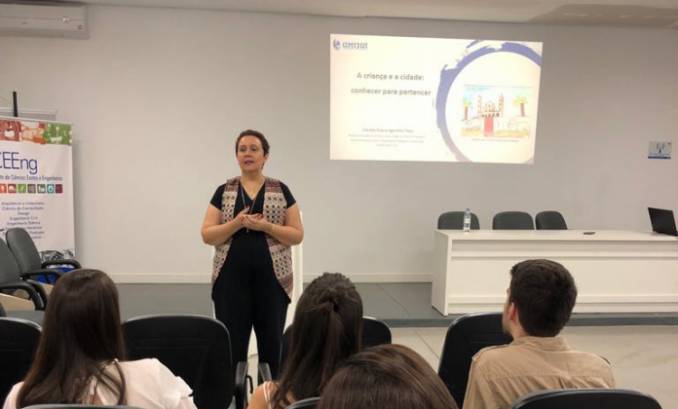 A noite contou com a presença da professora de história, Drª Cláudia Eliane Ilgenfritz Toso, que proferiu a palestra - A criança e a cidade: conhecer para pertencer. A palestrante baseou sua fala refletindo acerca do ensino sobre a cidade nos anos iniciais do ensino fundamental, apresentando reflexões sobre o ensino da cidade e a construção do sentimento de pertencimento, elementos esses, que fazem parte da pesquisa de seu Doutorado em Educação nas Ciências.