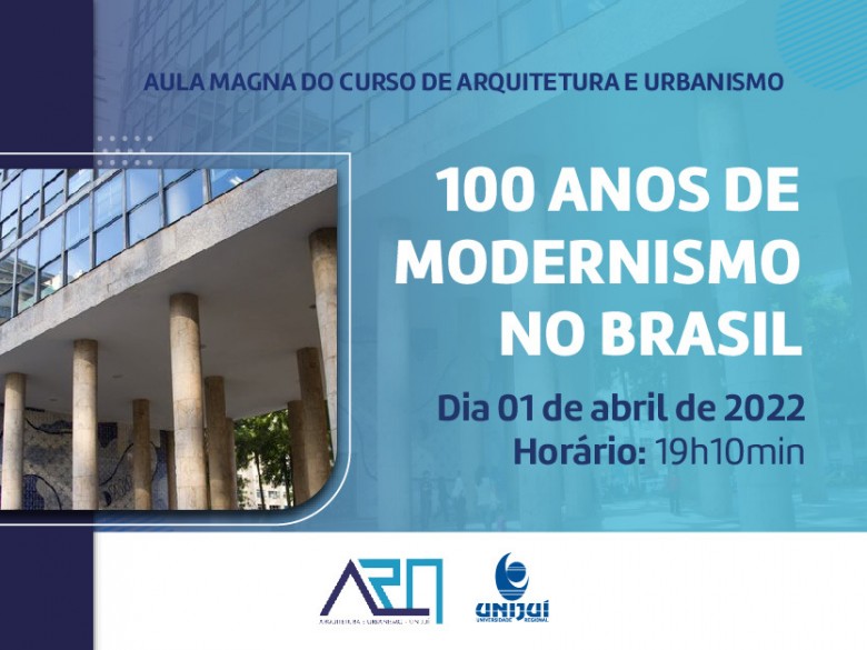 A partir das 19h10 desta sexta-feira, 1º de abril, acontece a aula magna do curso de Arquitetura e Urbanismo da Unijuí, de forma online, com transmissão pelo canal da Universidade no Youtube. Em discussão estará o tema “100 anos de Modernismo no Brasil”.