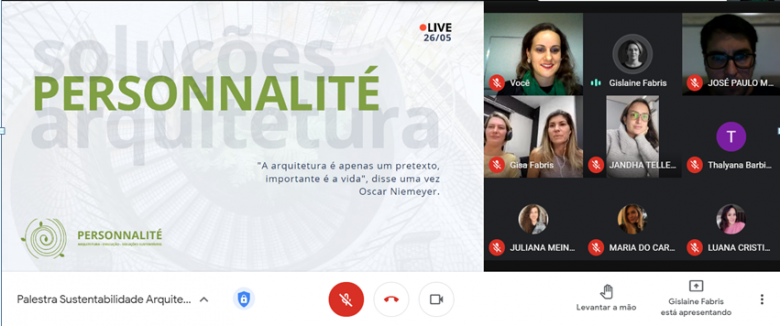 Pensando em aliar a teoria com a prática profissional para os estudantes da disciplina de Espaço Construído e Sustentabilidade do curso de Arquitetura e Urbanismo, a professora mestra Tenile Rieger Piovesan trouxe a palestra online “Arquitetura: será que a sustentabilidade custa caro mesmo?”, com as arquitetas e urbanistas e consultoras em Inovação, Design e Sustentabilidade, Gisa Fabris e Maria Carolina Barreto, do Escritório Personnalité Arquitetura, falando ao vivo da cidade de Sinop-MT na noite da última quarta-feira, dia 26 de maio.
