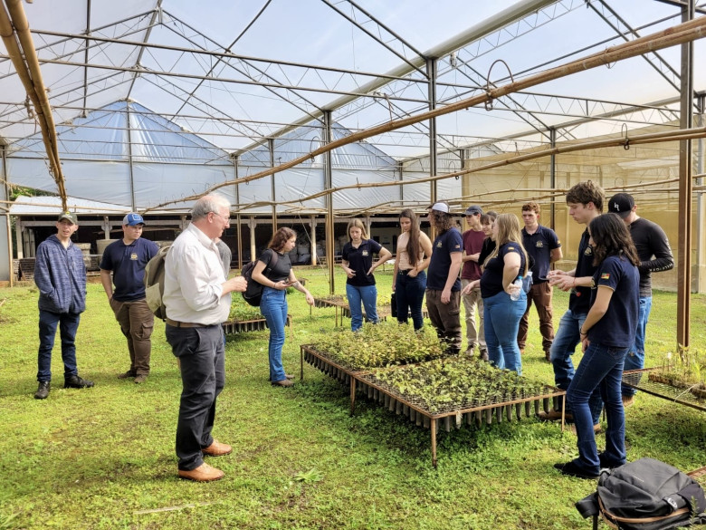 Enquanto isso, a turma 322 visitou o IRDeR, onde o engenheiro agrônomo César Sartori compartilhou a história do instituto, destacando a importância do campo nas atividades de pesquisa e extensão e como essas práticas contribuem para o desenvolvimento da região. Ele também apresentou as diversas práticas de manejo sustentável desenvolvidas no local. Os professores doutores Roberto Carbonera e Vidica Bianchi enfatizaram a importância da preservação das áreas naturais, o uso racional de agroquímicos, a conservação dos recursos hídricos e a relevância do viveiro de mudas de árvores nativas para reflorestamento e recuperação ambiental. Durante a visita, os alunos foram encorajados a observar atentamente as interações entre os diferentes organismos e o ambiente, reforçando os conceitos de ecologia e sustentabilidade discutidos no curso.
