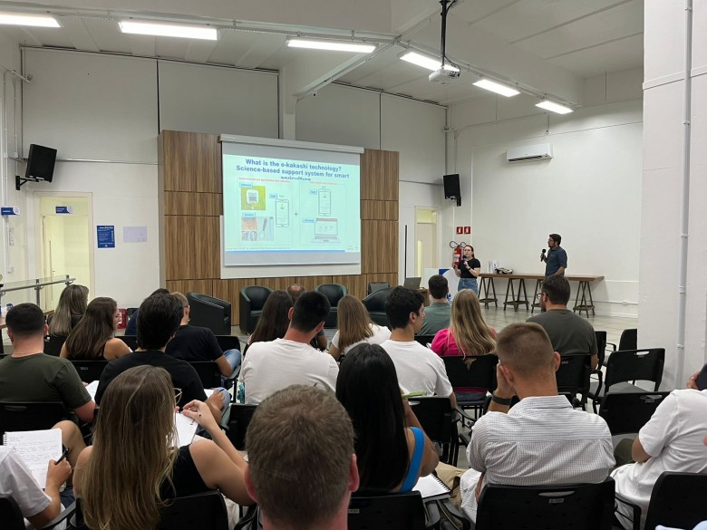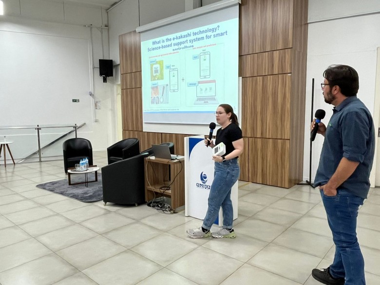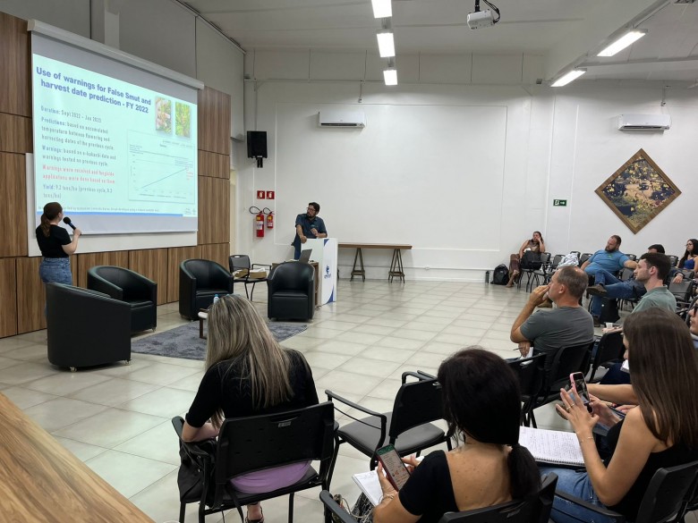 Estiveram presentes a representante do Centro Internacional de Agricultura Tropical (Ciat Colômbia), Mariana Quintero, que falou sobre a tecnologia e-Kakashi, que é o dispositivo usado como sensor de umidade de solo e faz o cálculo de outros parâmetros para auxiliar os agricultores na tomada de decisões. Também estiveram o representante da empresa Crops Team, Enrico Fleck Tura, que abordou o manejo de doenças na soja utilizando os dados gerados pelo e-Kakashi, e o analista de Pesquisa e Desenvolvimento da empresa Fockink, Matheus Meotti, que relatou sobre os dados da empresa ao utilizar o sistema e o manejo da irrigação e suas tecnologias.