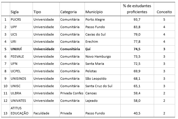 Enfim, os resultados finais desta avaliação foram divulgados esta semana e evidenciaram a excelente performance dos estudantes do curso de Medicina da Unijuí no contexto dos demais cursos. Dos 20 cursos existentes no RS, sete são oferecidos por instituições públicas federais. No grupo dos 13 cursos mantidos por instituições privadas (com fins lucrativos) e comunitárias (sem fins lucrativos), a classificação foi a seguinte:
