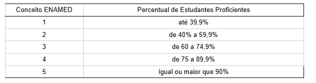 Já o conceito (nota) no Enamed foi atribuído pela quantidade de estudantes que atingiram a proficiência em relação ao respectivo número de estudantes concluintes de cada curso, ou seja, está atrelado ao percentual de estudantes proficientes, segundo faixas dispostas na tabela abaixo: