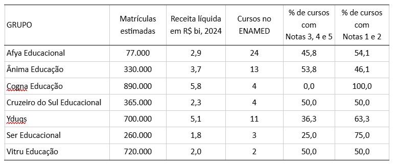 É evidente que uma avaliação desta natureza, pela sua magnitude e importância, traz à tona as mais diferentes reações e análises. Neste contexto é interessante observar que os maiores grupos educacionais brasileiros, que concentram mais de 60% das matrículas do Ensino Superior e são dominados por grandes corporações com capital aberto, tiveram um desempenho deplorável no ENAMED, evidenciando de um modo em geral que instituições privadas priorizam ganhos em detrimento de uma oferta de qualidade, à exemplo do que aconteceu no Rio Grande do Sul e no Brasil, conforme demonstrado na tabela abaixo.