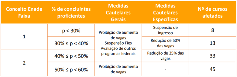 Para 107 dos 351 cursos avaliados que obtiveram resultados não satisfatórios (conceitos 1 e 2) o MEC/INEP prevê, além da instauração de de processo administrativo, a adoção de medidas cautelares, sintetizadas nos seguintes termos: