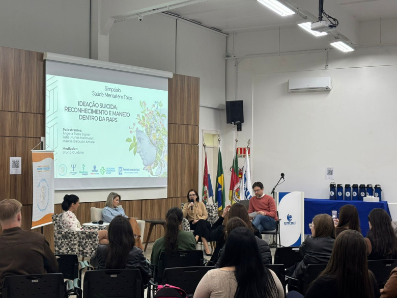 A atividade de abertura foi a mesa-redonda “Ideação Suicida: Reconhecimento e Manejo dentro da RAPS”, que contou com a participação da médica Júlia Nunes Mallmann, da psicóloga Márcia Baiocchi Amaral e da enfermeira Ângela Turra Signor. A mediação ficou a cargo do psiquiatra e professor do curso de Medicina, Bruno Luiz Guidolin, juntamente com uma estudante de Medicina.