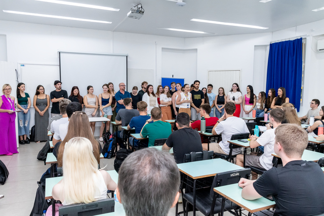 Para marcar o ingresso de 40 novos estudantes de Medicina, uma recepção especial foi realizada no prédio 38, sala 07, reunindo professores, a coordenação do curso, a reitoria e veteranos. Os calouros foram recepcionados pela Cia Cadagy e receberam as boas-vindas da vice-reitora de Graduação, professora Bruna Comparsi, que destacou a satisfação da Universidade em acolher uma nova turma.
